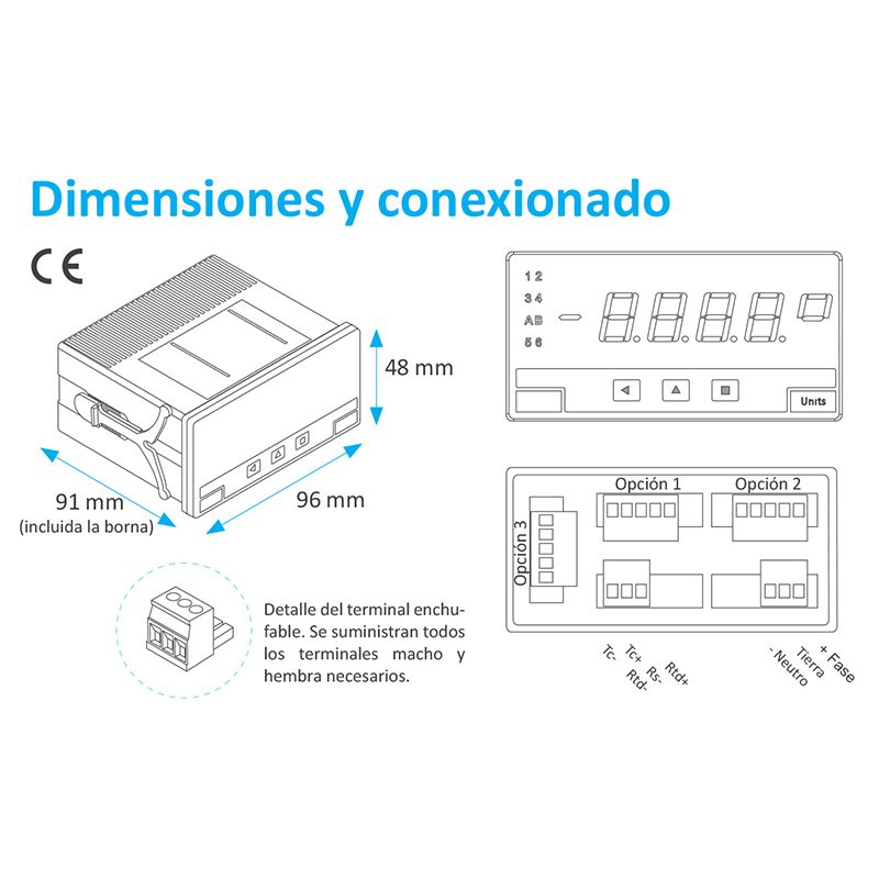 Indicador digital de panel de 4 digitos para señales de temperatura de tipo Pt100 y Termopar, para todo tipo de aplicaciones en industria.Acepta sondas tipo Pt100 a 2 y 3 hilos, y termopares J,K,T,E,S,R,N,L,C y X, con indicación en ºC o ºF, compensación automática de la unión fría, compensación de la resistencia del cable, y resolución configurable a 1º o 0.1º.